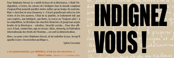 La gran sorpresa ha sido Indignez-vous! porque no llegaba precedido de ningún premio ni publicidad. Una editorial pequeña, Indigène, de Montpellier, atreviéndose ha dado un ejemplo al viejo estilo de los grandes editores. Al margen de las opiniones sobre las proposiciones de la rebeldía pacífica contra los grandes poderes financieros que controlan y descontrolan la vida social, económica y política de las actuales democracias, más como Thoreau que como Ghandi, lo más significativo de este fenómeno editorial es que se ha convertido también en acontecimiento social por la expectación creada y el contenido subversivo. Es como si la insurrección pacífica contra el consumo masivo, el desprecio por los débiles y la competencia de todos contra todos, las críticas a la falta de libertad de expresión y autonomía de la prensa, el respeto por los Derechos Humanos estuvieran buscando un libro y una mano que las escribiera mientras daban vueltas en la cabeza de una gran mayoría.