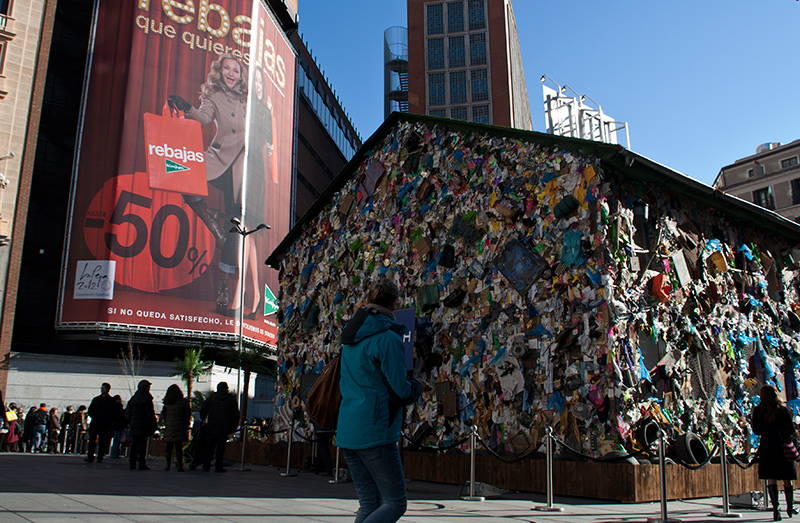 Así ha quedado el hotel-basura del artista alemán HA Schult en la plaza Callo, ya remozada en el mismo centro de Madrid, entre Sol y la Gran Vía. La instalación forma parte del proyecto de la cerveza Coronita por contribuir a la conservación del medio ambiente, específicamente de las playas que se ven amenazadas por el detritus humano que sin compasión arrojan como si el mar fuera el basurero del mundo. Quienes hemos vivido cerca del mar sabemos muy bien lo que sucede y cómo se ve el pobre mar enfermo por la porquería.
