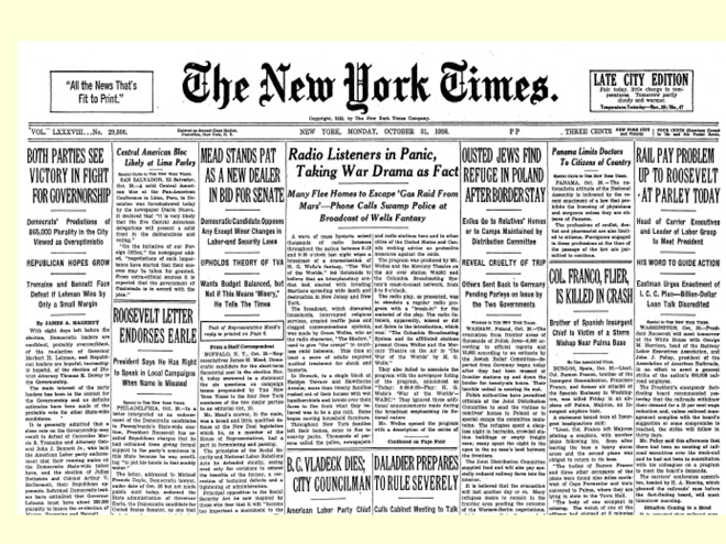 Histórica página del New York Times que noticia el pánico social del día anterior durante la transmisión de Orson Welles relatando la supuesta invasión de los marcianos.