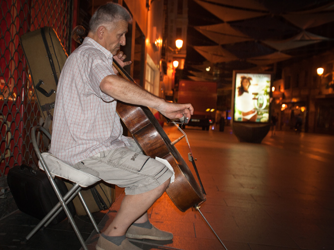 Sin embargo, a pesar de todo, como suele suceder en todas partes y en las peores situaciones, siempre surge un motivo para la nunca bien ponderada paradoja que pone las piezas en su lugar para comprenderlas. Por encima del aire y en medio de la incertidumbre, surgieron las notas de la segunda suite para violoncelo solo de Bach. Venían de otra soledad que no era la mía y vino a salvarme de la vulgaridad de la refriega. Dejé la contingencia y subí por la calle Preciados siguiendo la oscura melodía del corazón del cello. Junto a una pared estaba el hombre en su oasis. Eran más de las 12 de la noche y parecía no atender a otra cosa que a su propia historia triste en la que era feliz mientras se encontraba consigo mismo. Un pobre genio en mendicidad, seguramente de origen rumano por la forma de tocar, se dejaba los dedos y el alma mientras los jóvenes lo ignoraban con sus rabiosas consignas.
