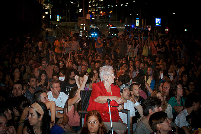 En la última marcha contra la reforma de la Constitución se produjo un hecho que me hizo reconsiderar por un momento mi aversión a las emociones fáciles. Una anciana de más de ochenta años se unió a los jóvenes y los jaleó dándoles ánimo apoyándose en su bastón. Luego esos mismos la acomodaron en una butaca, se sentaron en el suelo a su alrededor para discutir los pasos futuros del 15-M y la nombraron presidenta por un día. Una secuencia que hubiera envidiado cualquier director progre de cine italiano. Otro anciano que había sido expulsado por la policía de la acampada de algunos mayores en el Paseo del Prado sugirió crear una comisión de veteranos para integrar a las personas mayores a las luchas reivindicativas por sanear la democracia.