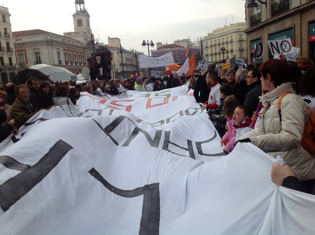 Estoy sentado en Sol, centro geográfico de España, y emblemática plaza donde surgió el movimiento de protesta ciudadana español que mantuvo en jaque al gobierno local y a la sociedad española. Todavía se oyen los pitidos y los cánticos contra la privatización de la sanidad pública que lleva a cabo el gobierno. La marea blanca de protesta llega a su fin. Ha venido mucha gente, además del que escribe hay alguien que se acerca llamándose un tal Lucas. Dice que con él ya son un millón de personas. No lo creo, aunque sí ha venido mucha gente. Este Lucas es como el de Cortázar, paradójico, imprevisible y poético, es mi hijo sin dudas. Hablemos de política, me dice. Yo enmudezco. Tiene 8 años al parecer «hackeados». Creo que además de un tal Lucas ha venido gente que no viven de la sanidad pública, pero sí temen dejar de vivir si se privatizan los servicios que antes suponían un privilegio de la sociedad del bienestar, puestos en peligro por la obsesión europea del déficit.