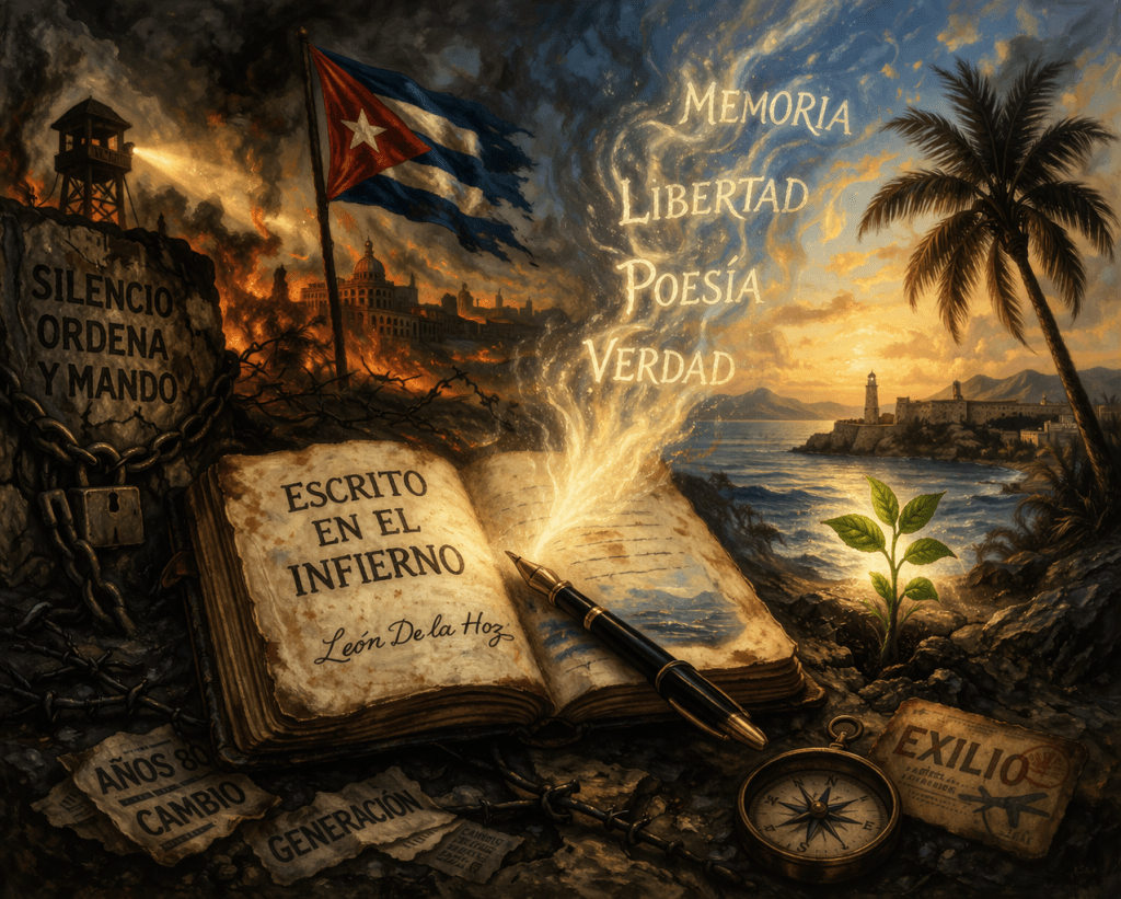 Hay libros que no se leen: se atraviesan. Escrito en el infierno, del poeta cubano León de la Hoz (Santiago de Cuba, 1957), es uno de ellos. Publicado por la Editorial Betania en 2026, este volumen reúne tres cuadernos esenciales —Coordenadas (1982), La cara en la moneda (1987) y Los pies del invisible (1988)— que funcionan como testimonio lírico de una época decisiva y, al mismo tiempo, como una cartografía espiritual del desarraigo, la lucidez y la resistencia.