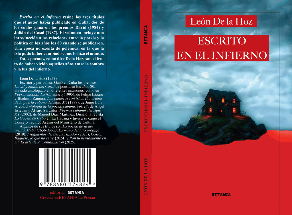 Nos complace presentar Escrito en el infierno (Betania, 2026), de León De la Hoz, un libro que reúne íntegros los libros que el autor publicó mientras vivía en la isla. No se trata de una antología, ni tampoco de todos los libros escritos allí, ya que Betania ha publicado Cuerpo divinamente humano (1999), un poemario ilustrado por Roberto Fabelo, que iba a salir en la Editorial Unión con el nombre de El libro oscuro del deseo. Y como cuenta el autor en su prólogo, pronto dará a conocer Las puertas del naufragio, un inédito que en 1990 debió salir en Letras Cubanas. Ambos libros dejaron de publicarse listos para entrar en producción.